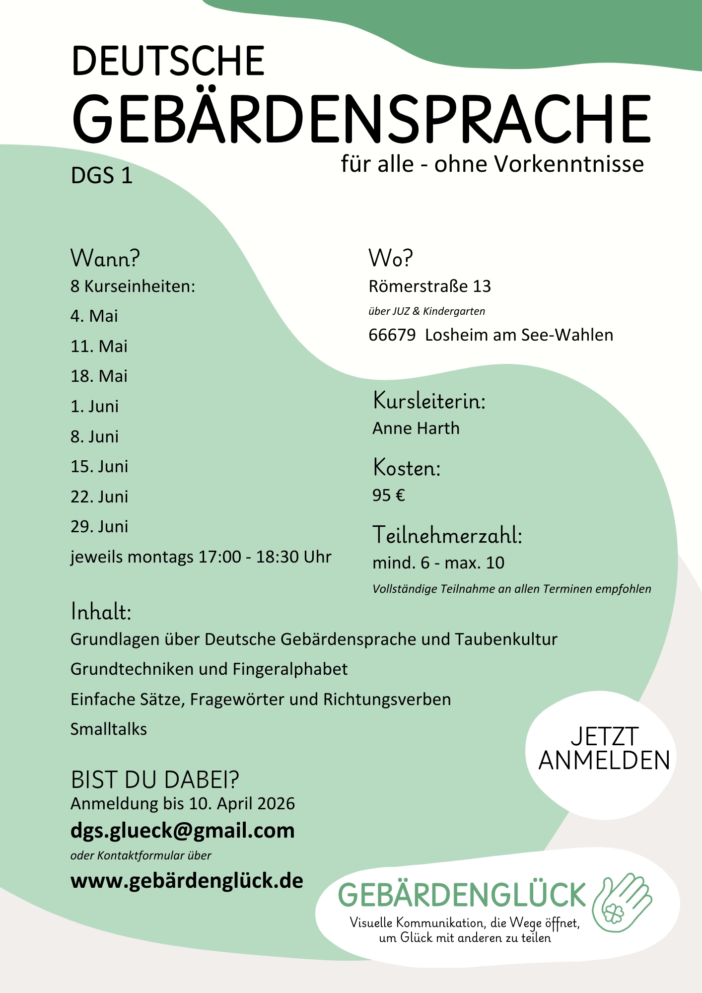 Ich bin Anne Harth, freiberufliche Dozentin für Deutsche Gebärdensprache (DGS) – und Muttersprachlerin. Mit meiner Familie und zwei Kindern lebe ich in Losheim am See im Saarland. Die Gebärdensprache begleitet mich von klein auf und ist weit mehr als nur ein Kommunikationsmittel – sie ist ein zentraler Teil meiner Identität und Kultur.
